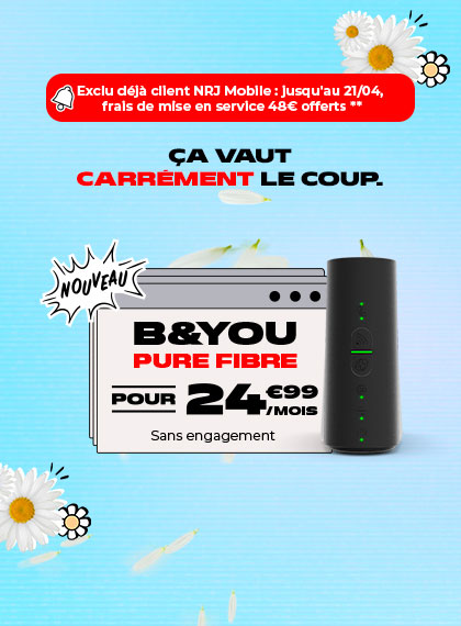 B&YOU Pure fibre : offre valable à partir du 07/04/26 pour toute première souscription, sous réserve d’éligibilité en fibre jusqu’au domicile et de raccordement. Sans engagement. Frais de mise en service : 48€ ; frais de résiliation : 69€. Appels vers mobiles ou fixes en France métropolitaine, DOM, Europe et international non inclus dans l'offre (hors n° d'urgence). Appels facturés hors forfait. Voir conditions sur bouyguestelecom.fr. 24,99€/mois. Débits maximum théoriques fibre : jusqu’à 2 Gbit/s en débit descendant (jusqu’à 1 Gbit/s avec un boîtier de terminaison optique externe) et 900Mbit/s en débit montant. Test d’éligibilité sur bouyguestelecom.fr.
